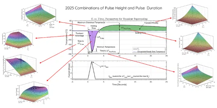 In figure 8, the center of the image shows shows a typical plot that might be found in the literature for transient thermoelectric pulse cooling. Each of the characteristic parameters is listed on the plot. For the work herein, each of the characteristic parameters for transient thermoelectric pulse cooling was plotted on the z-axis of a three-dimensional plot. The independent variables on the x and y-axis were pulse height and duration. 2025 combinations of pulse height and duration were used to create the surfaces. (Also see: analysis of transient thermoelectric pulse cooling for each characteristic plot).